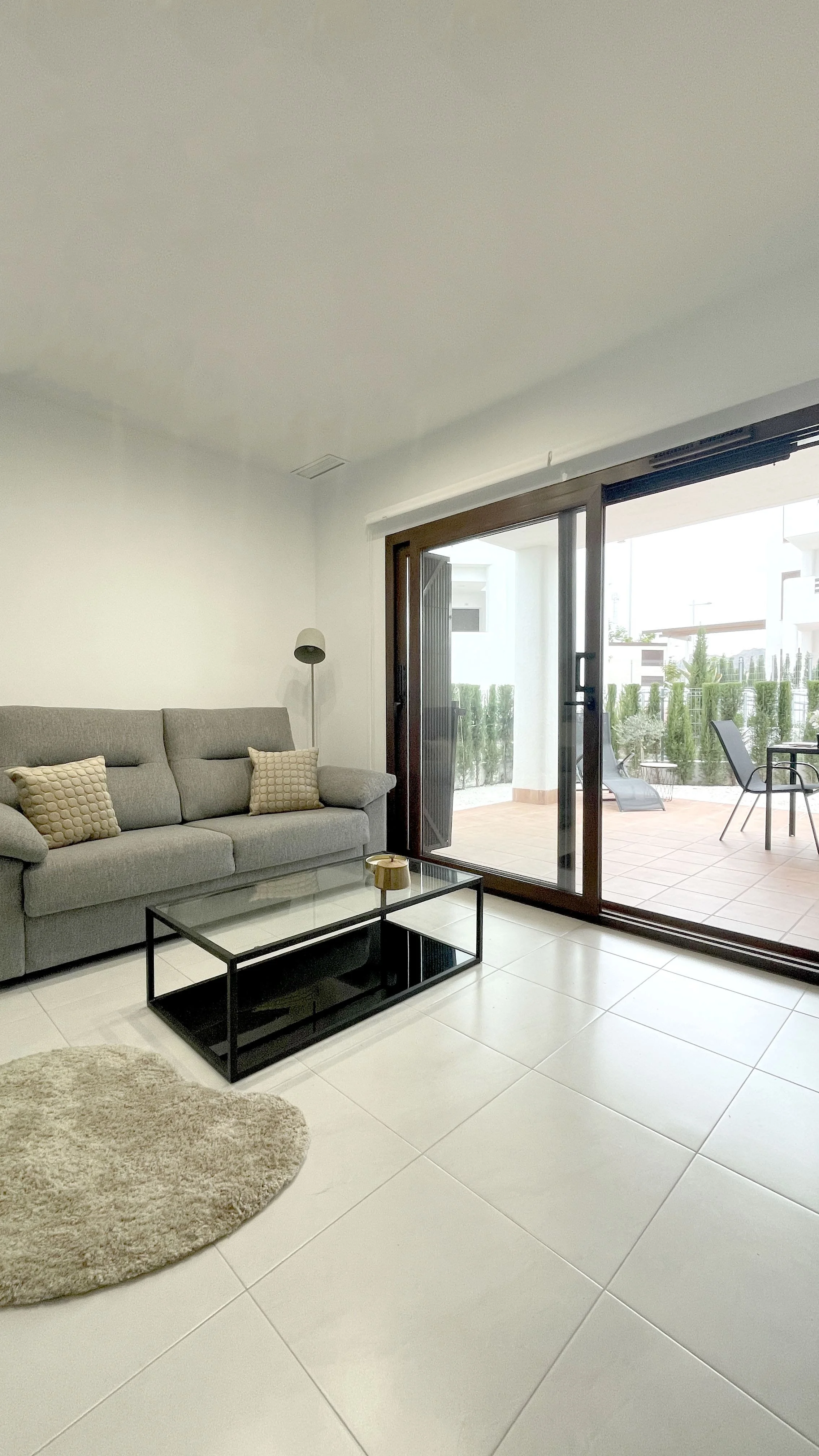 The apartment is fully equipped and can accommodate up to four people thanks to the double sofa bed in the living room. Sliding doors open onto the terrace with a dining area, sitting area and sun lounger. Beautiful walkways lined with palm trees, exotic flowers and greenery will take you to the communal swimming pools, jacuzzis and playgrounds in just a few steps. Sunbeds and parasols are provided around the pools. Everything for a relaxing and, above all, unforgettable stay on the beautiful Spanish coast.